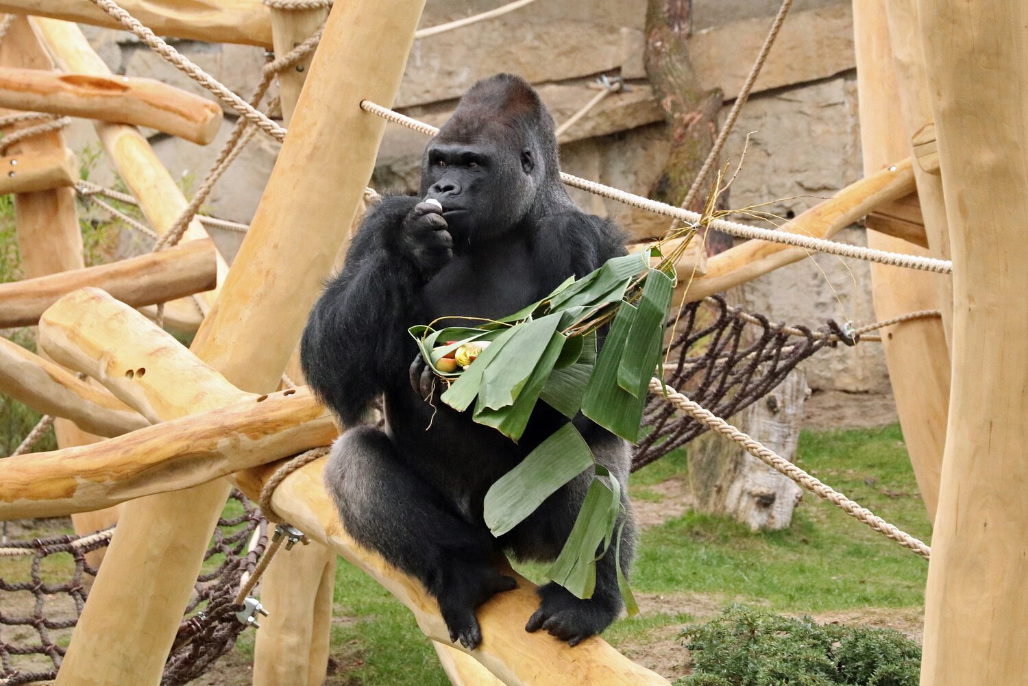 „Normalerweise füttern wir unsere Gorillas fast ausschließlich mit Gemüse, da es weniger Zucker- und Fruchtsäuren enthält“, erklärt Zoo- und Tierparkdirektor Dr. Andreas Knieriem. „Daher freut sich Ivo besonders, wenn er zu seinem Ehrentag auch etwas Obst bekommt.“ Tatsächlich sammelte Ivo zuerst das Obst heraus, bevor auch seine Damen sich an der Piñata bedienen durften.