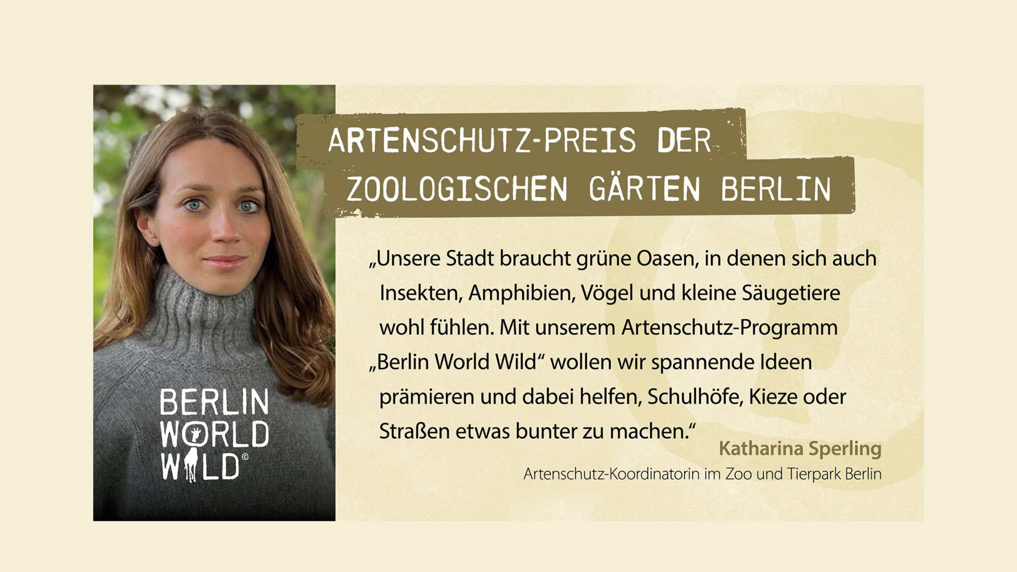 Grüne Klassenzimmer, insektenfreundliche Schulgärten oder doch selbstgebaute Fledermauskästen? Noch bis zum 10. Juni können Sie Ihre Ideen für den Schutz der Artenvielfalt einreichen. Spannende Konzepte werden im Rahmen des Artenschutz-Programms der Zoologischen Gärten Berlin „Berlin World Wild“ ausgezeichnet und mit einem Preisgeld unterstützt. Mit dabei in der Jury ist auch Katharina Sperling, Artenschutz-Koordinatorin im Zoo und Tierpark Berlin.