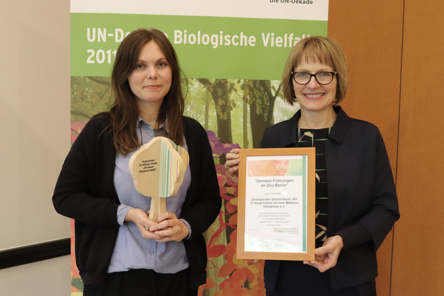 Die Zooschule wurde im Sonderwettbewerb „Soziale Natur – Natur für alle“ der UN-Dekade Biologische Vielfalt offiziell ausgezeichnet. Die Ehrung wird im Auftrag des Bundesumweltministeriums und des Bundesamtes für Naturschutz sowie von der Geschäftsstelle der UN-Dekade Biologische Vielfalt ausgerichtet. „Wir danken der Jury für die Auszeichnung und freuen uns, dass wir auch Menschen mit Beeinträchtigungen einen emotionalen Zugang zur faszinierenden Natur ermöglichen können“, verkündet Zoo- und Tierpark-Direktor Dr. Andreas Knieriem. Die Auszeichnung wird an Projekte verliehen, die soziale Grenzen und Hindernisse überwinden und gleichzeitig einen Beitrag zum Erhalt der biologischen Vielfalt leisten. „Bei unseren Touren durch den Zoo Berlin sollen Menschen mit Demenz mit mehreren Sinnen angesprochen werden und dabei für die vielfältige Tier- und Pflanzenwelt begeistert werden“ erklärt die Leiterin der Zooschule Svenja Eisenbarth. Den Teilnehmern soll die Möglichkeit geboten werden, sich auszutauschen, an Bekanntes anzuknüpfen sowie kulturelle Teilhabe zu genießen. „Wir freuen uns für die Kollegen vom Zoo Berlin über die Auszeichnung“, sagt Volker Homes, Geschäftsführer des Verbandes der Zoologischen Gärten. „Das ist eine tolle Bestätigung ihrer hervorragenden Arbeit.“ Die einzigartige Tour hat der Zoo Berlin gemeinsam mit dem Malteser Hilfsdienst und der Kulturvermittlerin Yola Herold entwickelt.