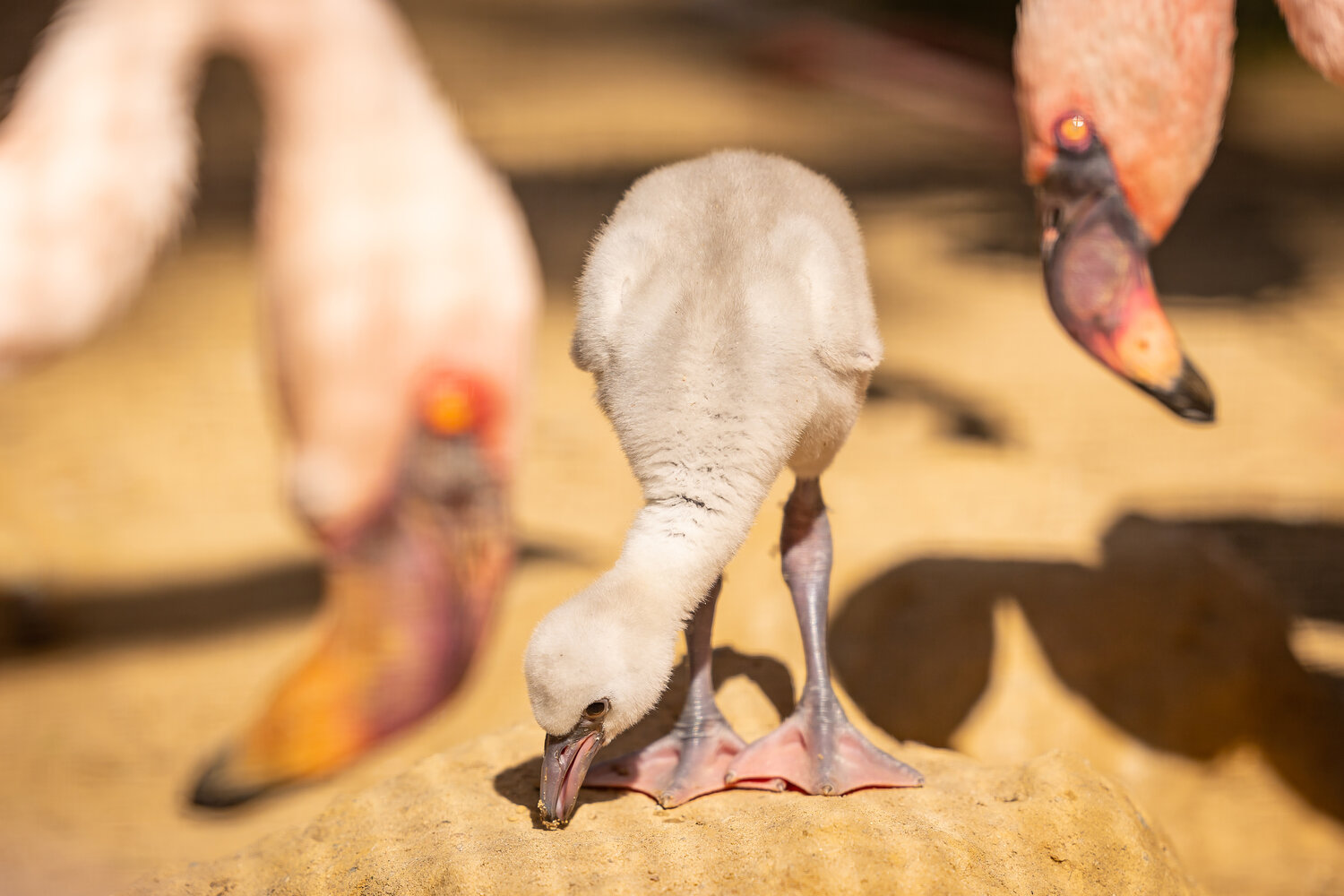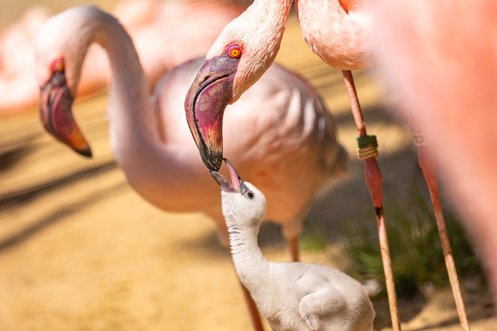 Acht Jahre haben wir gewartet, nun ist wieder ein kleiner Jungvogel geschlüpft. Das flauschige Küken hat vor Kurzem erstmals den Bruthügel verlassen. In den ersten Wochen wird es mit sogenannter „Kropfmilch“ gefüttert. Beide Eltern produzieren diese eiweiß- und fettreiche Energiebombe im oberen Verdauungstrakt und geben sie über den Schnabel weiter. Für die Filtertechnik ist der Schnabel der Küken noch nicht gut genug entwickelt.