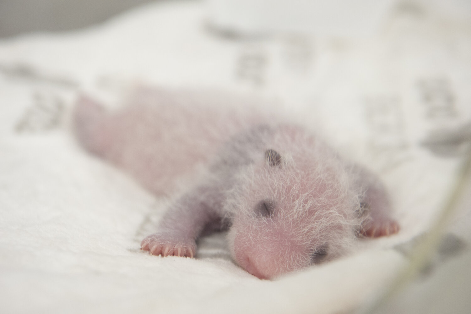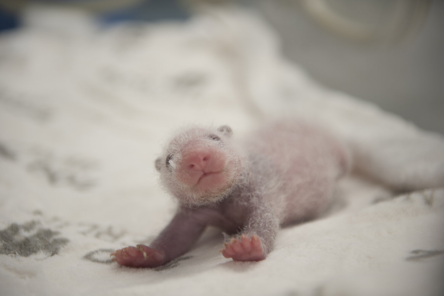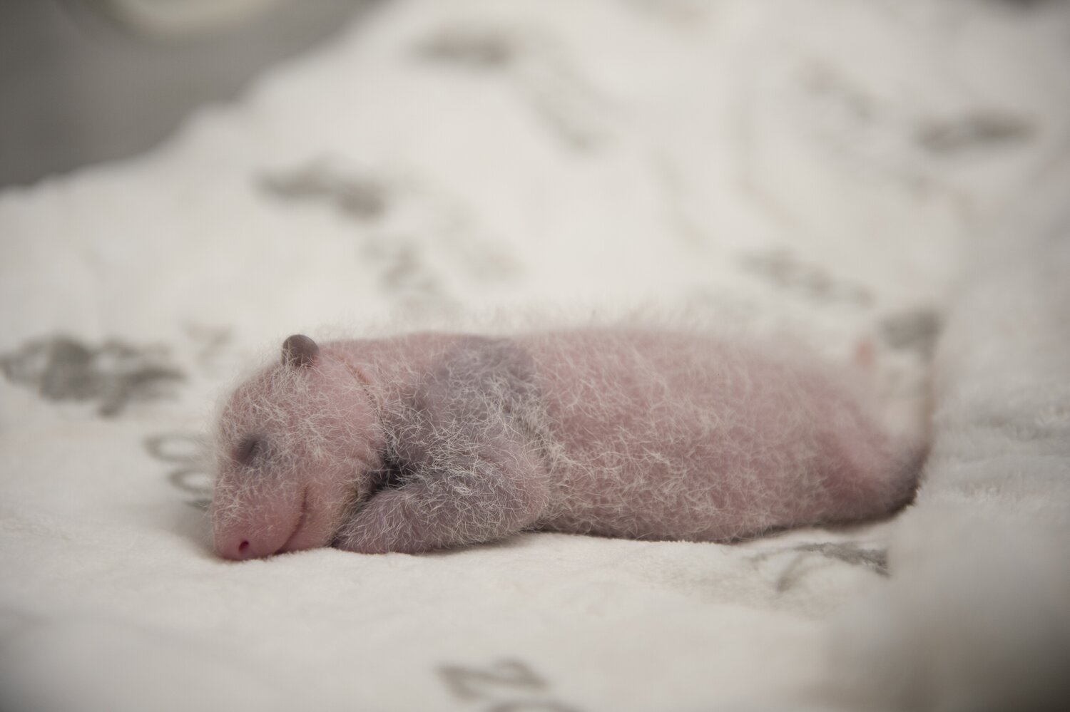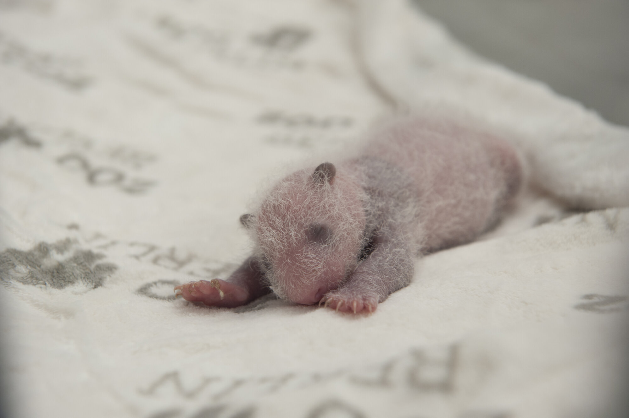 Mit pelzigen schwarzen Ohren, charakteristischen Augenringen und wohlgenährtem Bauch sehen die kleinen Pandas im Alter von zwei Wochen langsam nach richtigen Pandas aus.