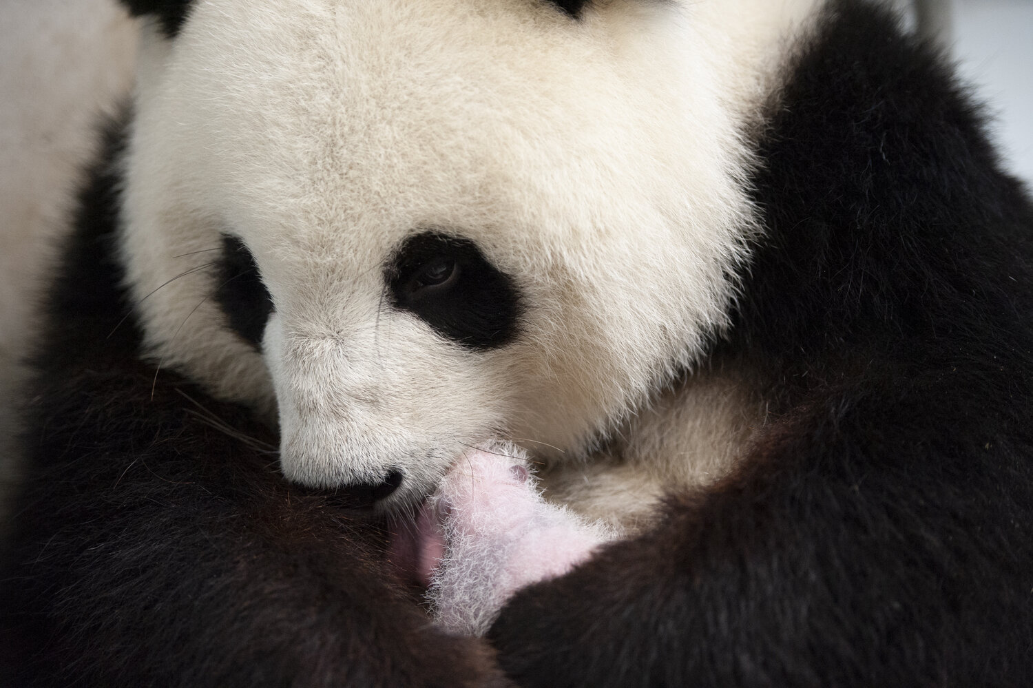 Während das eine Jungtier den schweren Kopf quietschend auf der Suche nach Mamas Zitze hebt, hat das zweite Jungtier im Inkubator im tiefen Schlaf alle Viere von sich gestreckt. Neben schwarzen Puschelohren und dunklen Ringen um die Augen ist seit kurzem auch an den Schultern der rosa schimmernden Baby-Pandas ein dunkler Gürtel zu erkennen. „Wir sind sehr zufrieden mit der Entwicklung der beiden Mini-Pandas. Wie man an der allmählichen Schwarz-weiß-Färbung der Zwillinge sieht, kommen sie – nun auch optisch – ganz nach Mama“, erklärt Zoo- und Tierpark-Direktor Dr. Andreas Knieriem. Warum Große Pandas in diesem charakteristischen Muster gefärbt sind, gibt seit jeher Rätsel auf. Ob der schwarz-weiße Pelz zur Tarnung, Wärmeregulation oder Kommunikation mit Artgenossen von Vorteil ist, konnten Wissenschaftler nie vollständig klären.
