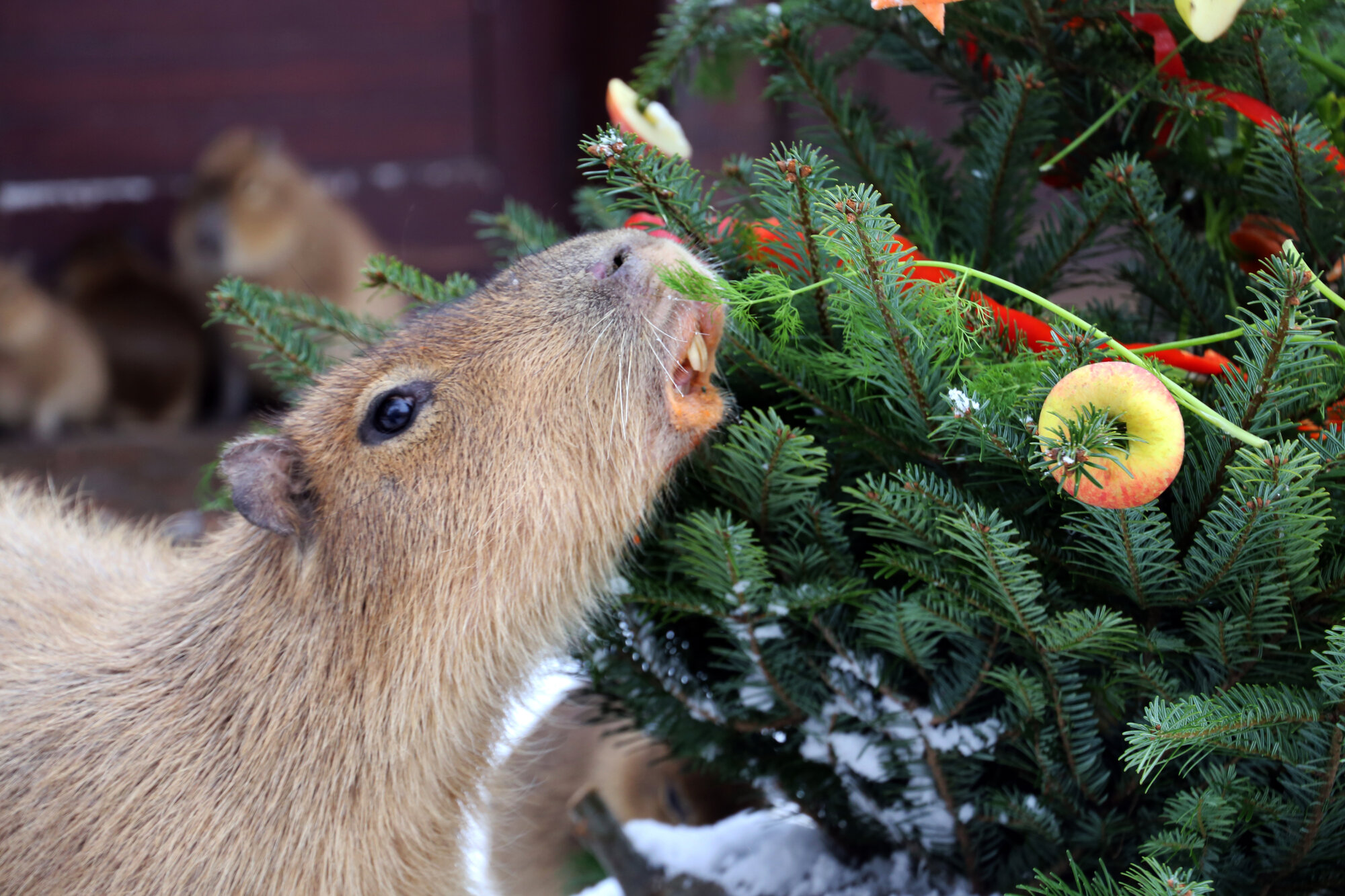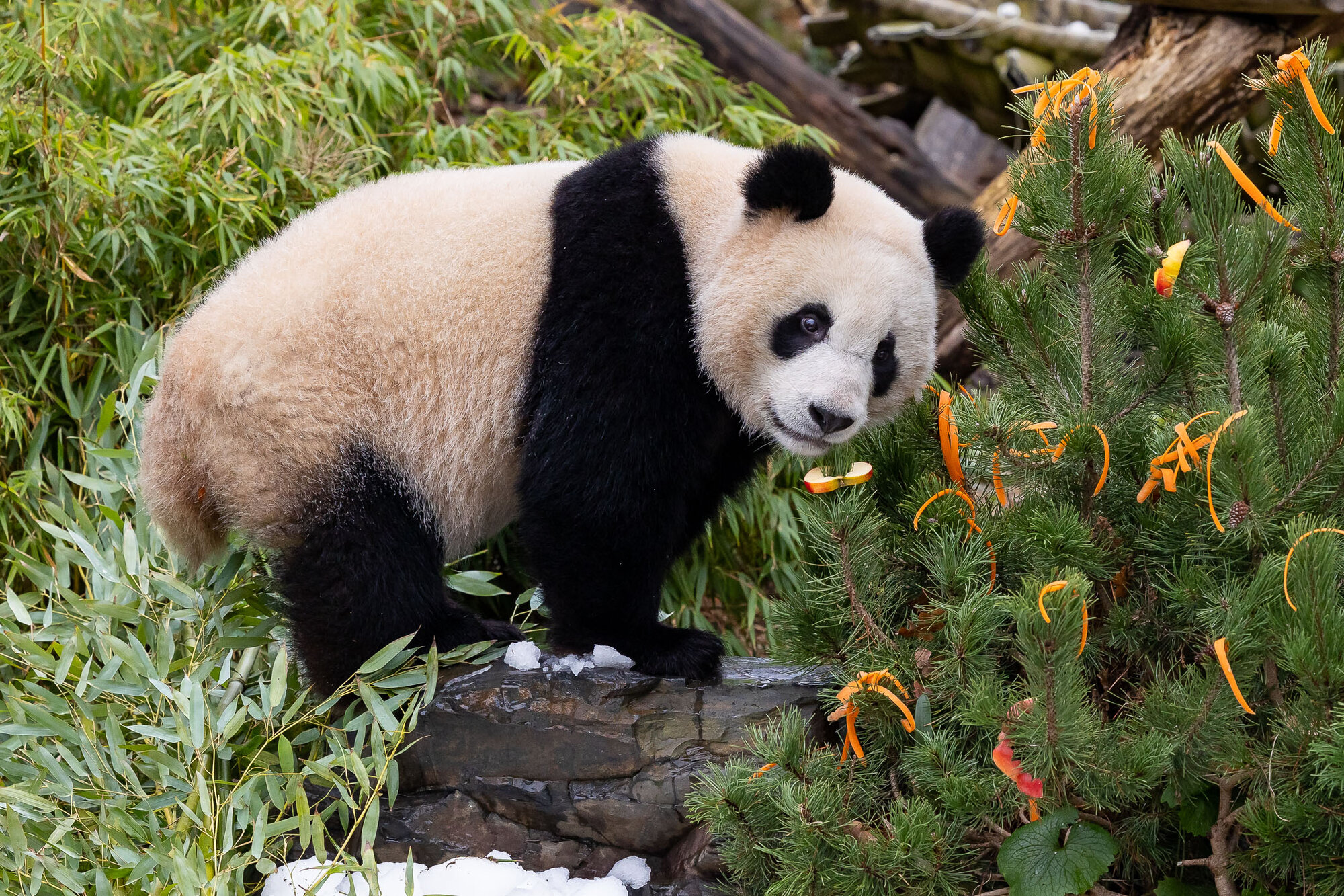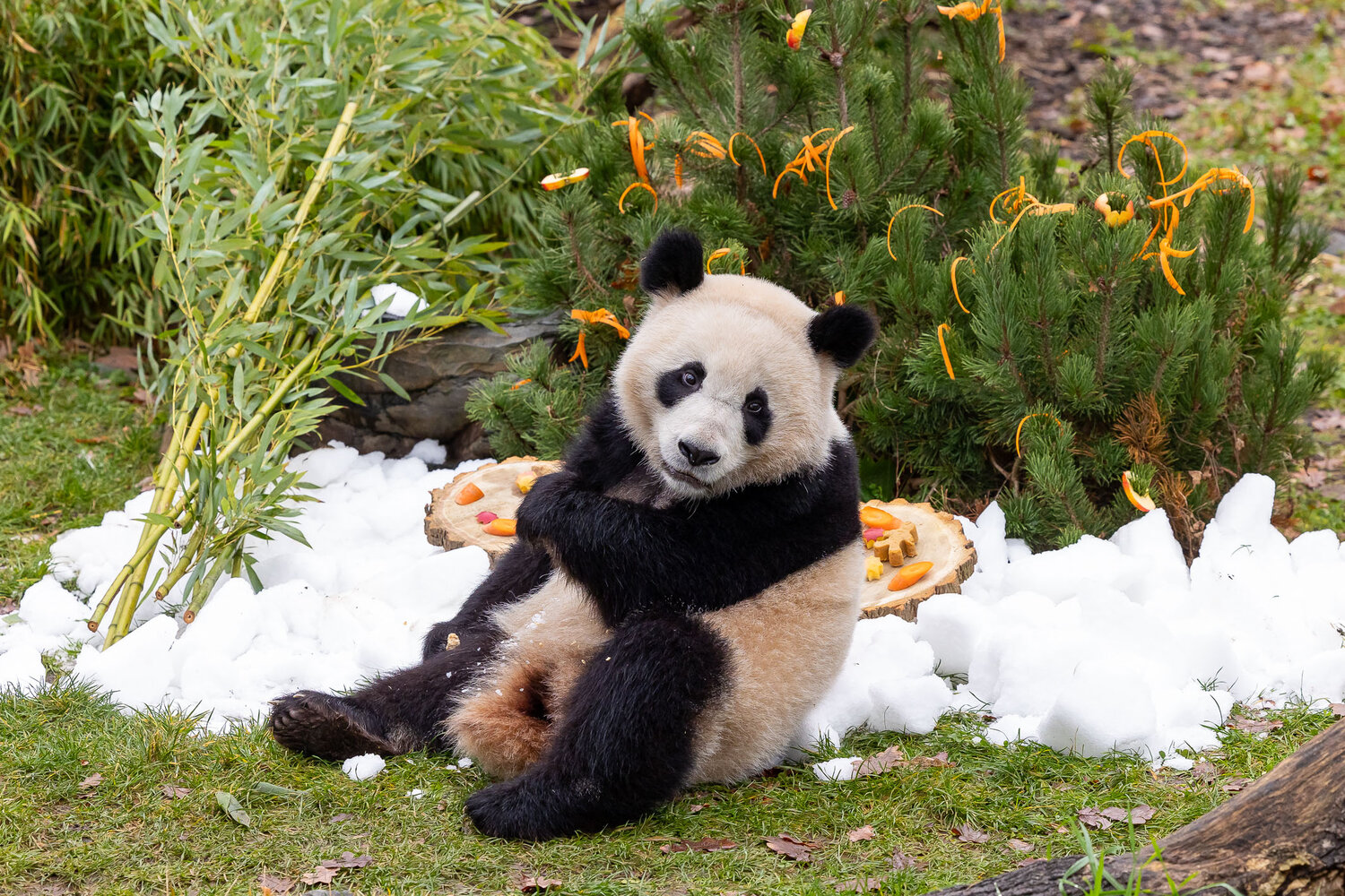 Die Tierpfleger*innen haben für die Großen Pandas im Zoo kleine Lebkuchenmännchen und Tannenbäume gebacken. Hauptbestandteil dieser speziellen Kekse – nach original chinesischem Rezept – sind Mais, Soja, Reis und Hafer. Wie bei Geschwistern nicht unüblich, herrschte unter dem Tannenbaum keinesfalls nur Frieden und Einigkeit: Paule war als erster am Baum und plünderte kurzerhand den Keksteller seines Bruders Pit und machte sich anschließend über den Baumschmuck her. Die Wasserschweine freuen sich über einen Schneemann und einen liebevoll dekorierten Tannenbaum mit Dill-Petersilien-Möhren-Girlanden und Baumschmuck aus Paprika und Süßkartoffeln. Für die Roten Pandas gab es eisige Tannenbäume aus Bambus.