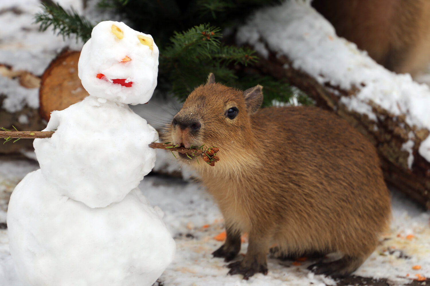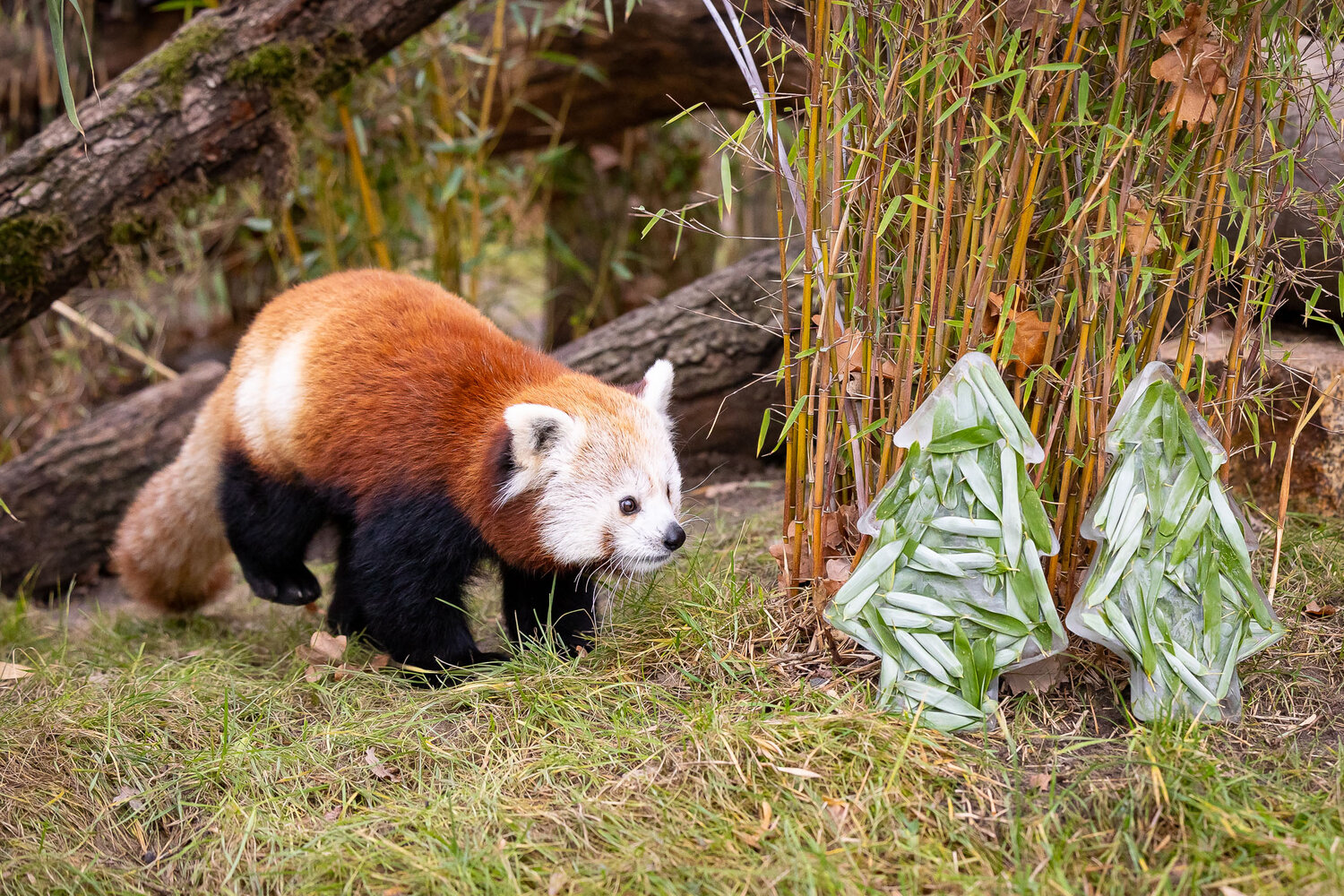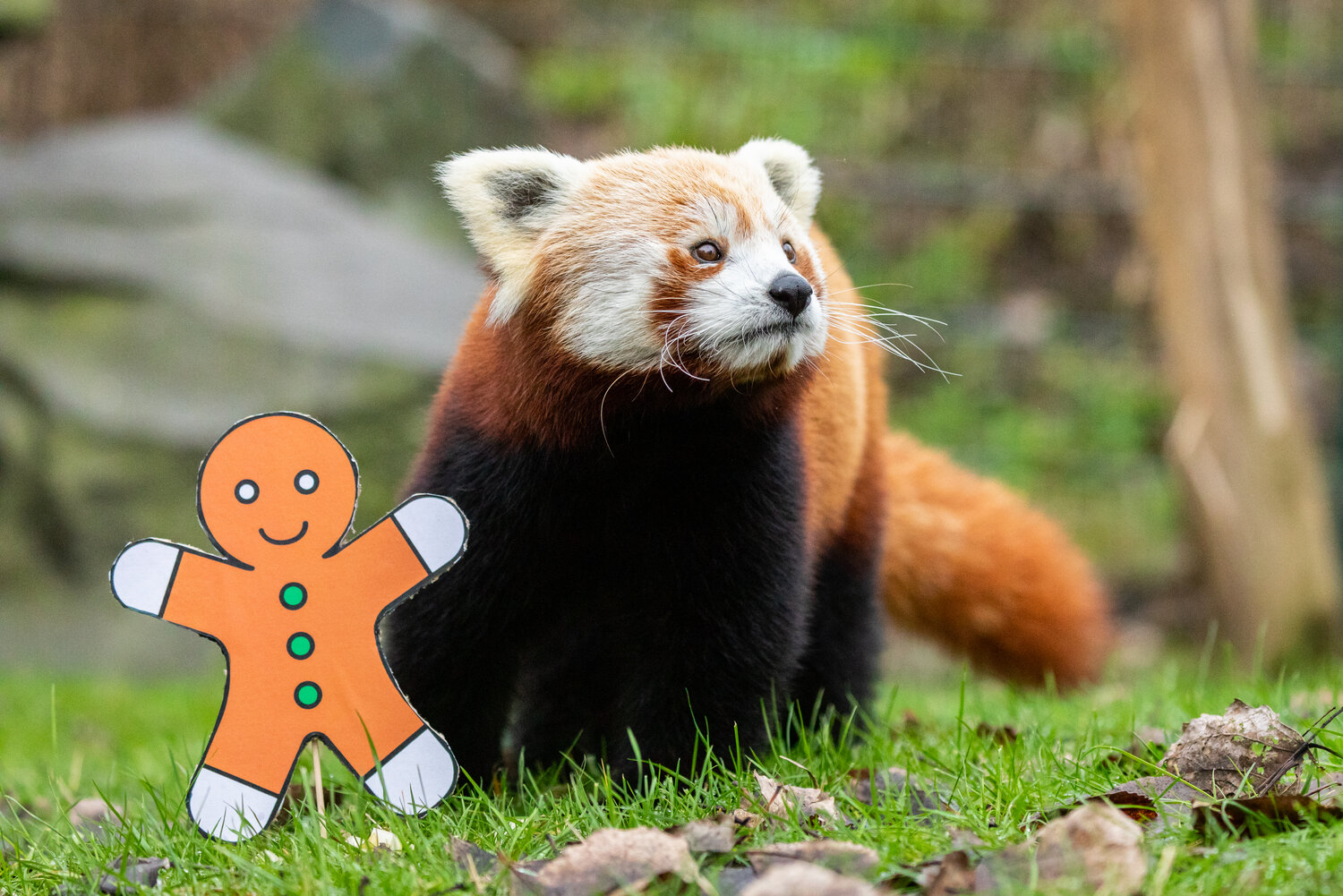 Die Tierpfleger*innen haben für die Großen Pandas im Zoo kleine Lebkuchenmännchen und Tannenbäume gebacken. Hauptbestandteil dieser speziellen Kekse – nach original chinesischem Rezept – sind Mais, Soja, Reis und Hafer. Wie bei Geschwistern nicht unüblich, herrschte unter dem Tannenbaum keinesfalls nur Frieden und Einigkeit: Paule war als erster am Baum und plünderte kurzerhand den Keksteller seines Bruders Pit und machte sich anschließend über den Baumschmuck her. Die Wasserschweine freuen sich über einen Schneemann und einen liebevoll dekorierten Tannenbaum mit Dill-Petersilien-Möhren-Girlanden und Baumschmuck aus Paprika und Süßkartoffeln. Für die Roten Pandas gab es eisige Tannenbäume aus Bambus.
