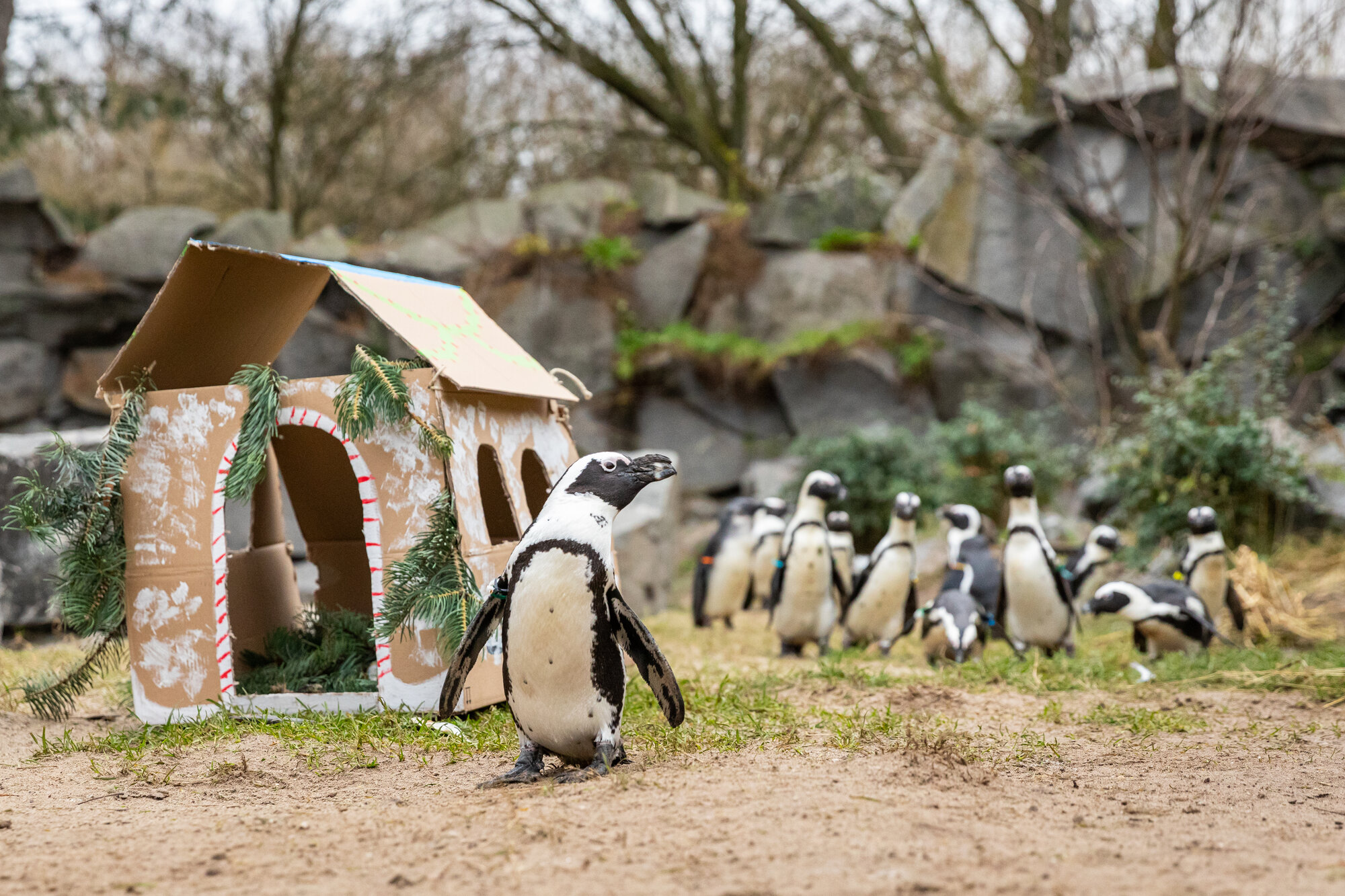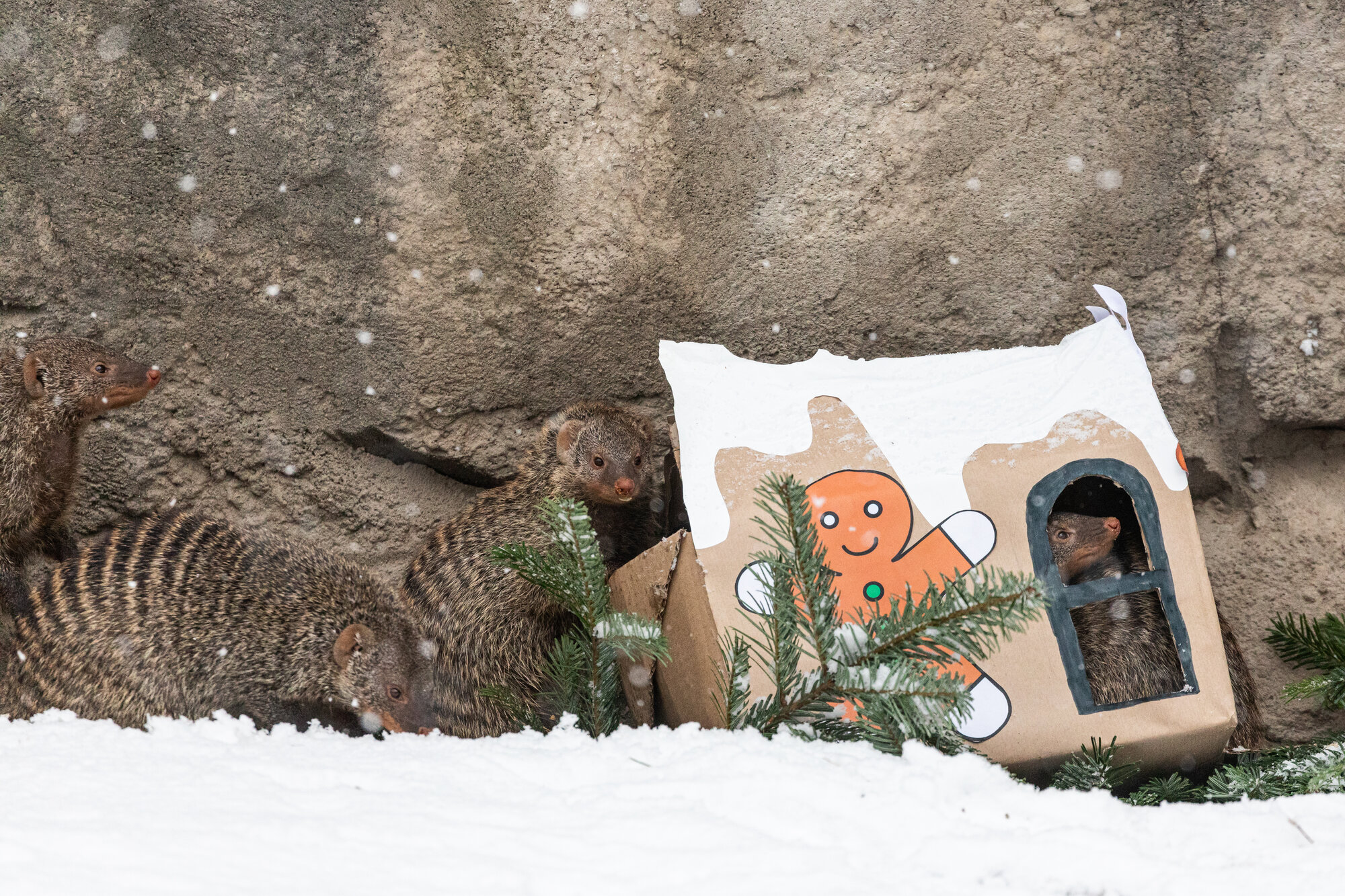 Die Zebramangusten im Tierpark wurden mit einem Knusperhäuschen mit leckerer Füllung überrascht und haben die weihnachtliche Abwechslung sichtlich genossen. Trotz der pandemiebedingten Einschränkungen der vergangenen 1 ½ Jahre konnte die Versorgung der rund 30.000 Tiere in Zoo und Tierpark zu jeder Zeit sichergestellt werden – auch dank zahlreicher Spender*innen: „Wir sind sehr dankbar für die Unterstützung, die wir tagtäglich erleben dürfen. Für ganze Generationen waren und sind Zoo und Tierpark grüne Rückzugsorte in unserer Großstadt – mit einer Portion Ehrfurcht blicke ich auf die tiefe Verbundenheit der zahlreichen Wegbegleiter*innen“, verkündet Zoo und Tierpark-Direktor Dr. Andreas Knieriem.