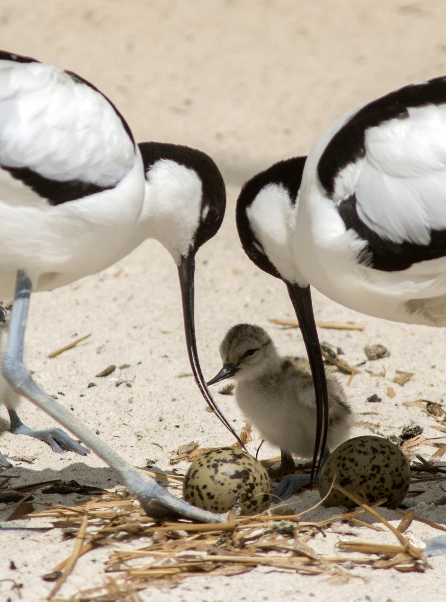 Der monochrome Juni begann mit dem Schlupf zweier – später einmal weißen – Krauskopfpelikane am 9. des Monats, gefolgt von einem flaumig silbrigen Rosa-Flamingo-Küken, das am 12. Juni zum ersten Mal von der Flamingo-Insel zum Festland herüberpaddelte. Am selben Tag pellten sich auch ein Säbelschnäbler-Küken aus dem Ei. Das Gefieder der Heranwachsenden wird mit ihrem schicken schwarz-weiß Look schon bald ein echter Hingucker sein - ebenso wie der Nachwuchs der dunklen Abdimstörche.