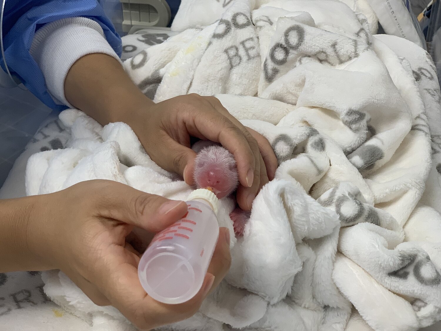 Nachdem der Nachwuchs die ersten zwei Tage nach der Geburt etwas an Gewicht verloren hatte, nehmen die Zwillinge nun wieder zu. Gerade das größere, erstgeborene Jungtier zeigt großen Appetit und wird von Meng Meng an allen vier Zitzen angelegt. Sein Geburtsgewicht hat der kleine Panda schon erreicht. Die Erstmilch der Mutter, das sogenannte Kolostrum – welches neben u.a. Enzymen, Vitaminen und Mineralien auch von der Mutter gebildete Antikörper enthält – unterstützt die Immunabwehr der Jungtiere. Zusätzlich zu Mamas Milchbar wird der kleinere der Zwillinge regelmäßig im Inkubator mit abgepumpter Milch von Meng Meng versorgt. Mit gekonnten Griffen bietet die chinesische Tierpflegerin dem Baby-Panda die kleine Trinkflasche an, worauf der Mini-Panda die Zunge zusammenrollt und die noch zahnlose Schnauze öffnet. Ungefähr alle zwei Stunden trinkt der kleine Panda, dessen Gewicht zeitweise auf 109 g gefallen war, rund 4-6 ml Milch. Mittlerweile bringt er schon wieder 130 g auf die Waage. „Ich möchte mich herzlich bei den Kollegen von der Charité für die Inkubatoren bedanken, so können wir Meng Meng in der Anfangszeit unterstützen und unseren Zwillingen einen guten Start in ihr Panda-Leben ermöglichen“, verkündet Zoo- und Tierpark-Direktor Dr. Andreas Knieriem. In den Inkubatoren kommen normalerweise kleine menschliche Neugeborene, nach einem eher schwierigen Start in das Leben, wieder zu Kräften.