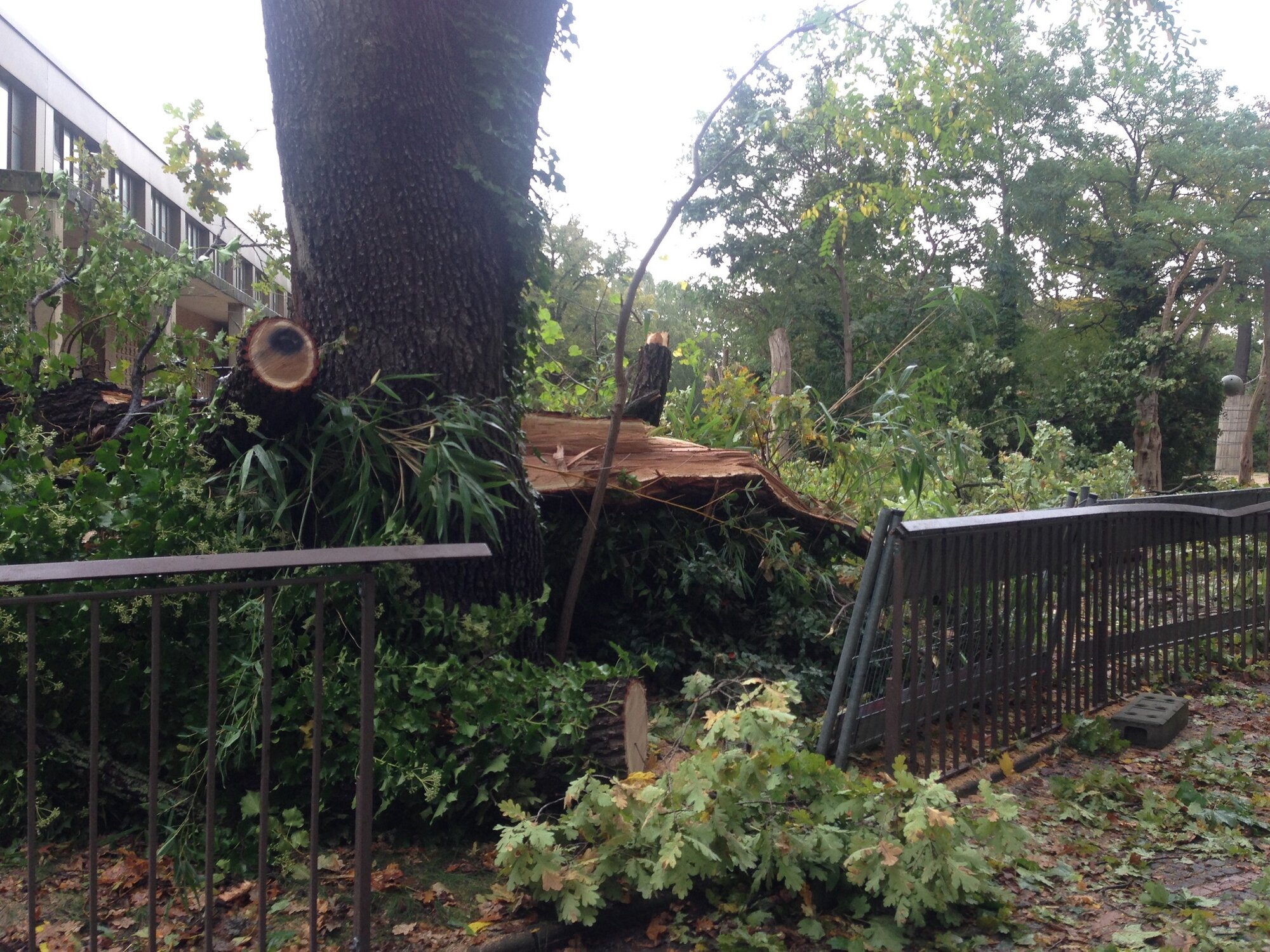 Auch im Tierpark sind die Schäden des gestrigen Orkans allgegenwärtig. Gerade um das historische Schloss Friedrichsfelde sind zahlreiche Bäume umgestürzt und machen nahezu alle Wege unpassierbar. Mit über 10.000 Bäumen hat der Tierpark einen besonders üppigen Baumbestand. Auch die Außenanlagen der Atlas-Hirsche und der Chaco-Pekaris wurden beschädigt, glücklicherweise sind im Tierpark weder Tiere noch Mitarbeiter zu Schaden gekommen.