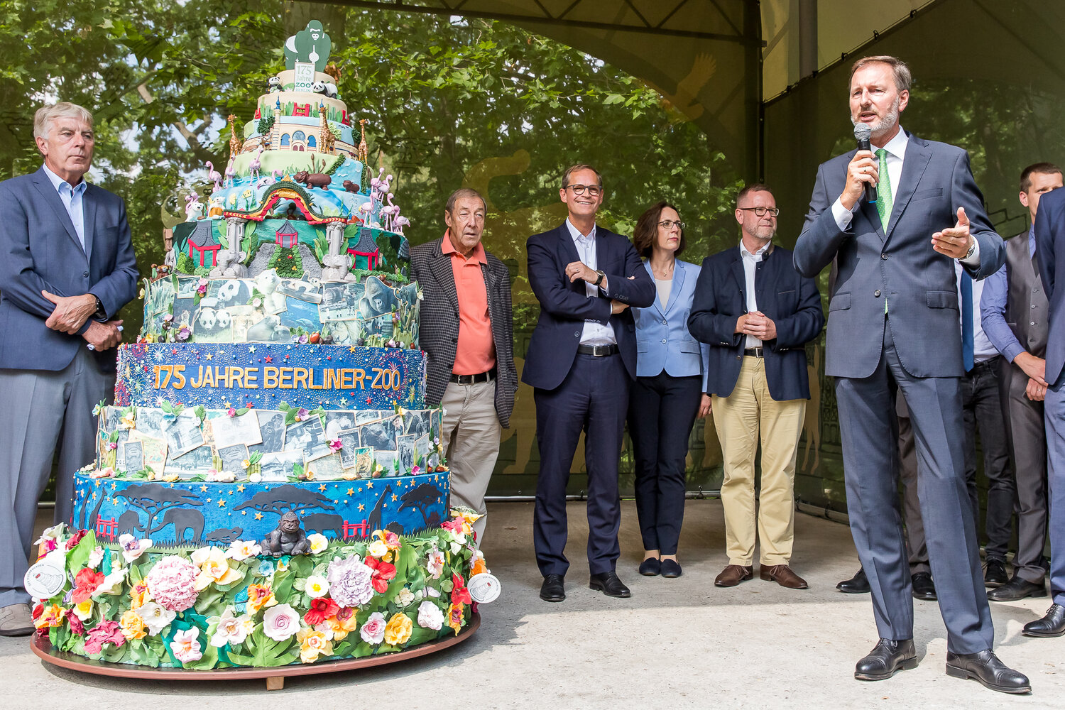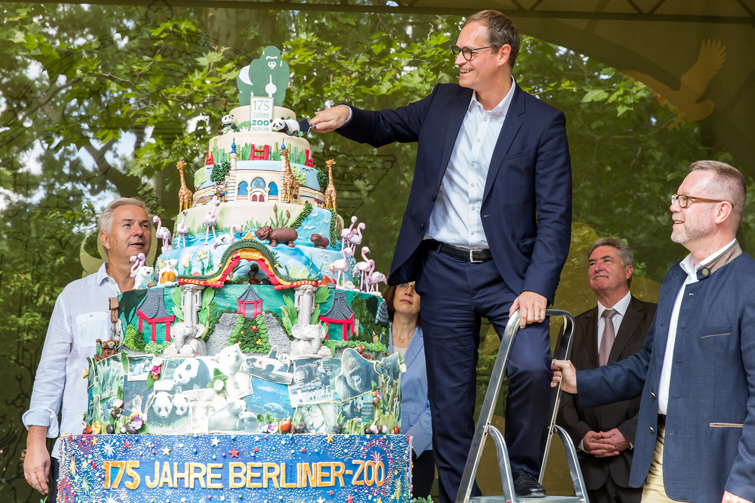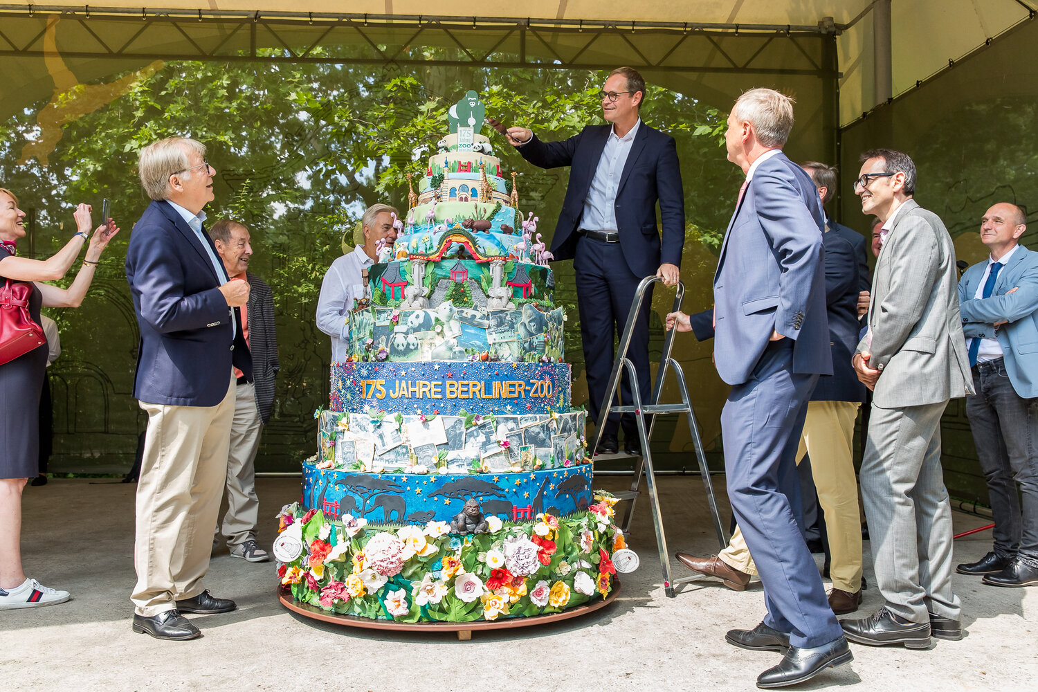 Der Regierende Bürgermeister Michael Müller persönlich schnitt die wohl exotischste Torte der Stadt an und läutete damit die Jubiläumsfeierlichkeiten ein. „Mit seinen faszinierenden Tieren steht der Zoo Berlin wie kaum eine andere Institution für unsere Stadt. Er bereichert seit 175 Jahren Berlin und ist von hier nicht mehr wegzudenken“, verkündete Müller zum Jubiläum. Besucher und langjährige Weggefährten des Zoo Berlin kamen in den Genuss der kunterbunten Geburtstagstorte. Fazit: Sieht nicht nur fantastisch aus – schmeckt auch so!