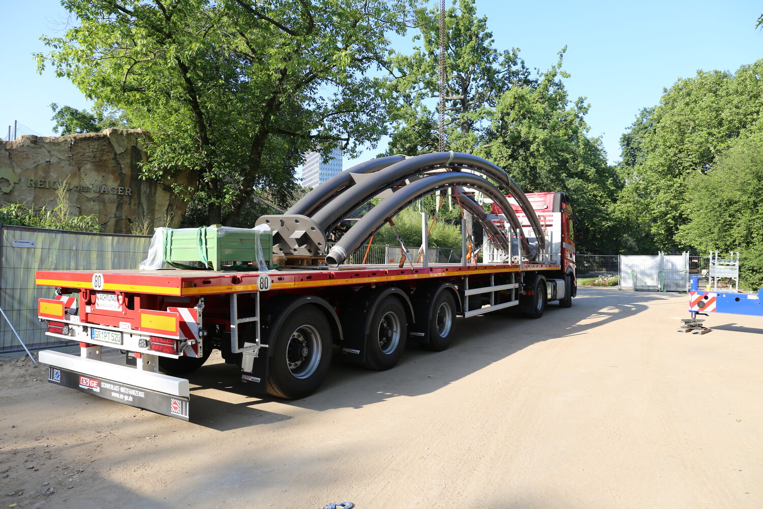 Der Bau unseres Tiergeheges für die Großkatzen schreitet sichtbar voran: Insgesamt sieben imposante Stahlbögen bilden die Grundstruktur der neuen Gehege. Jeder Bogen besteht aus zwei Segmenten, die direkt vor Ort zusammengesetzt werden. Die Bögen überspannen jeweils 20 bis 25 Meter und bringen pro Segment rund 5 Tonnen auf die Waage – eine beeindruckende Ingenieursleistung!