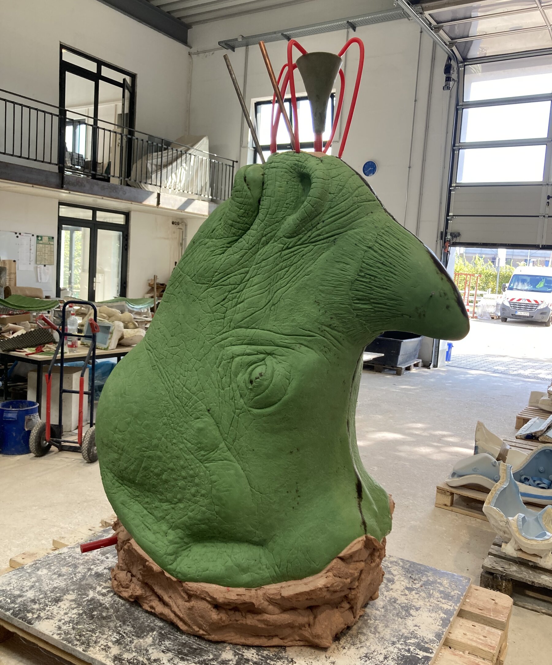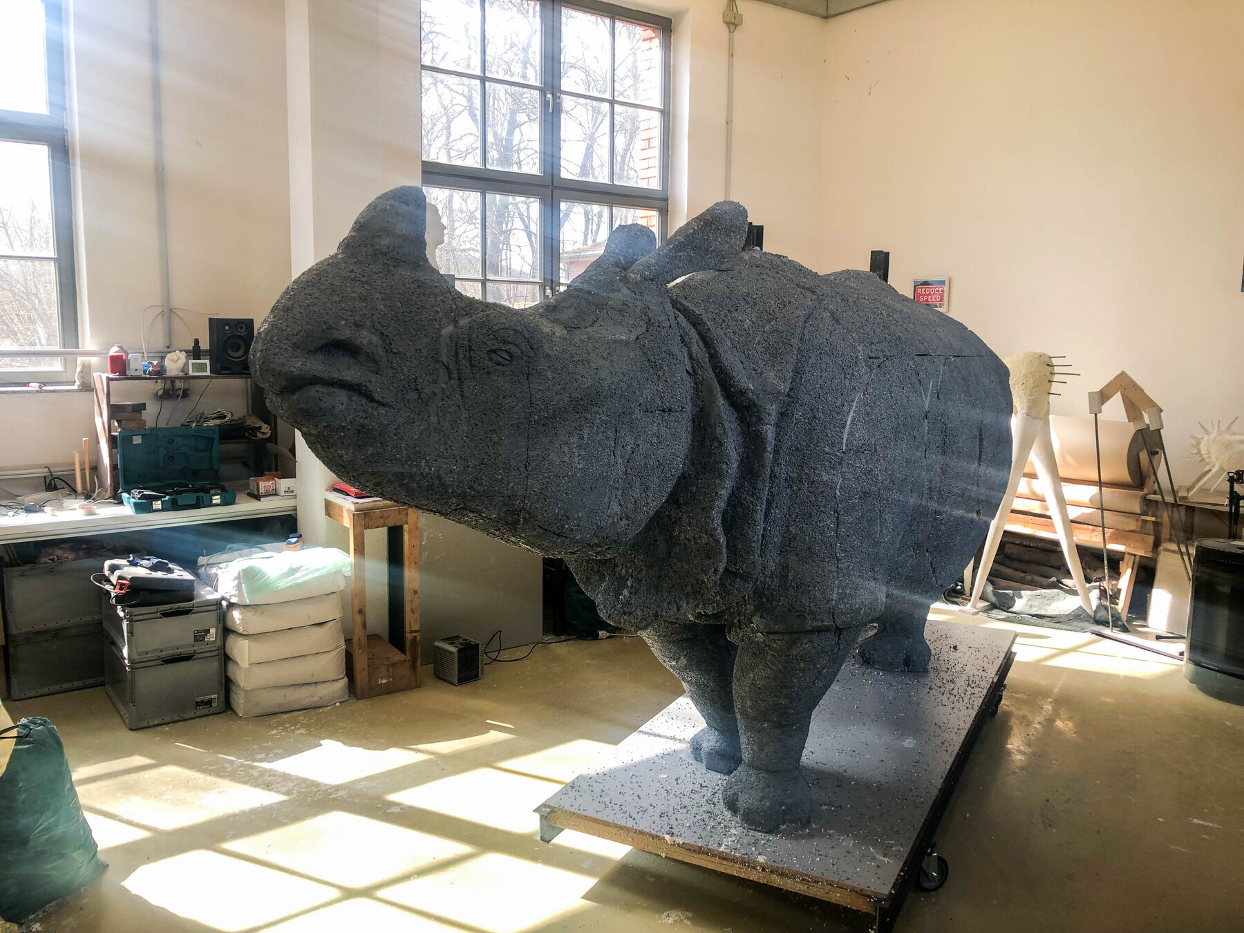 Die Modellierung des Endmodells begann mit der Verklebung von Styroporblöcken an ein rollbares Stahlgerüst. Das Styropor wurde anschließend auf das Volumenmodell heruntergeschnitten und zur besseren Visualisierung grau angestrichen. Schließlich wurde schichtweise Gips auf das Modell aufgetragen und durch ständiges Kratzen und Schaben nachgebessert, bis die endgültige Oberfläche erreicht wurde. An diesem Punkt ist die Arbeit des Bildhauers abgeschlossen, das Endmodell dient als Ausgangspunkt für die Herstellung des Bronzenashorns.