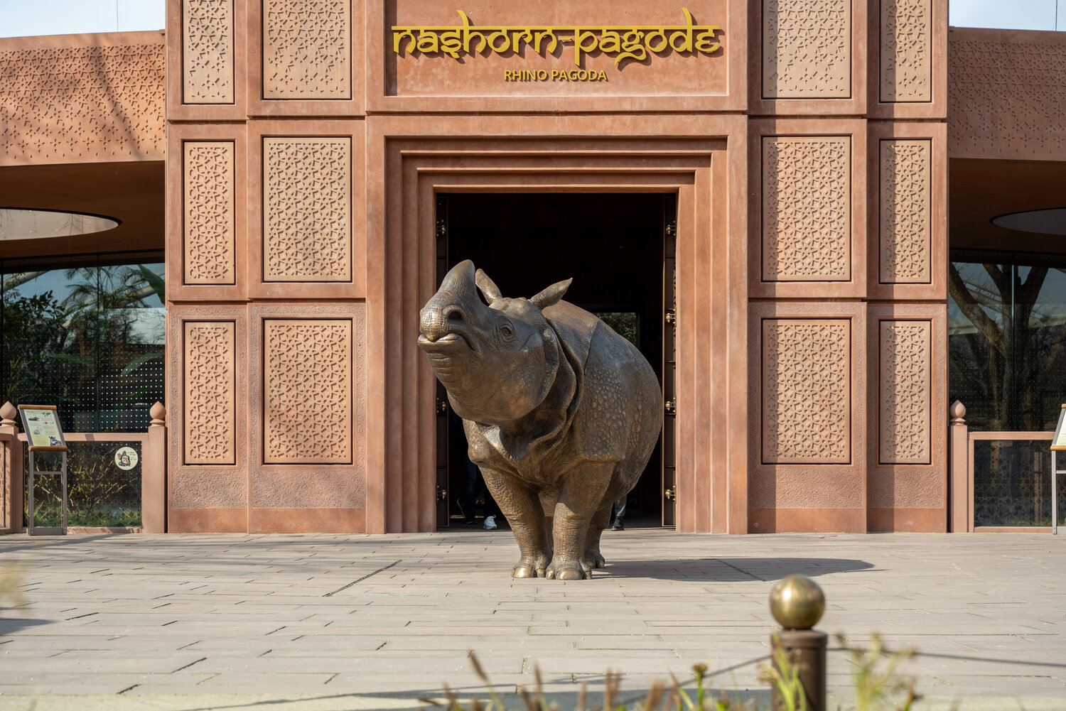 Einladend, majestätisch und zugeich sympathisch empfängt eine lebensgroße Nashornskulptur Zoo-Gäste auf dem Vorplatz der Nashorn-Pagode. Das imposante Kunstwerk ist Teil der didaktischen Ausstellung und führt den Besucher*innen die außergewöhnliche Größe dieser sanften Kolosse vor Augen.