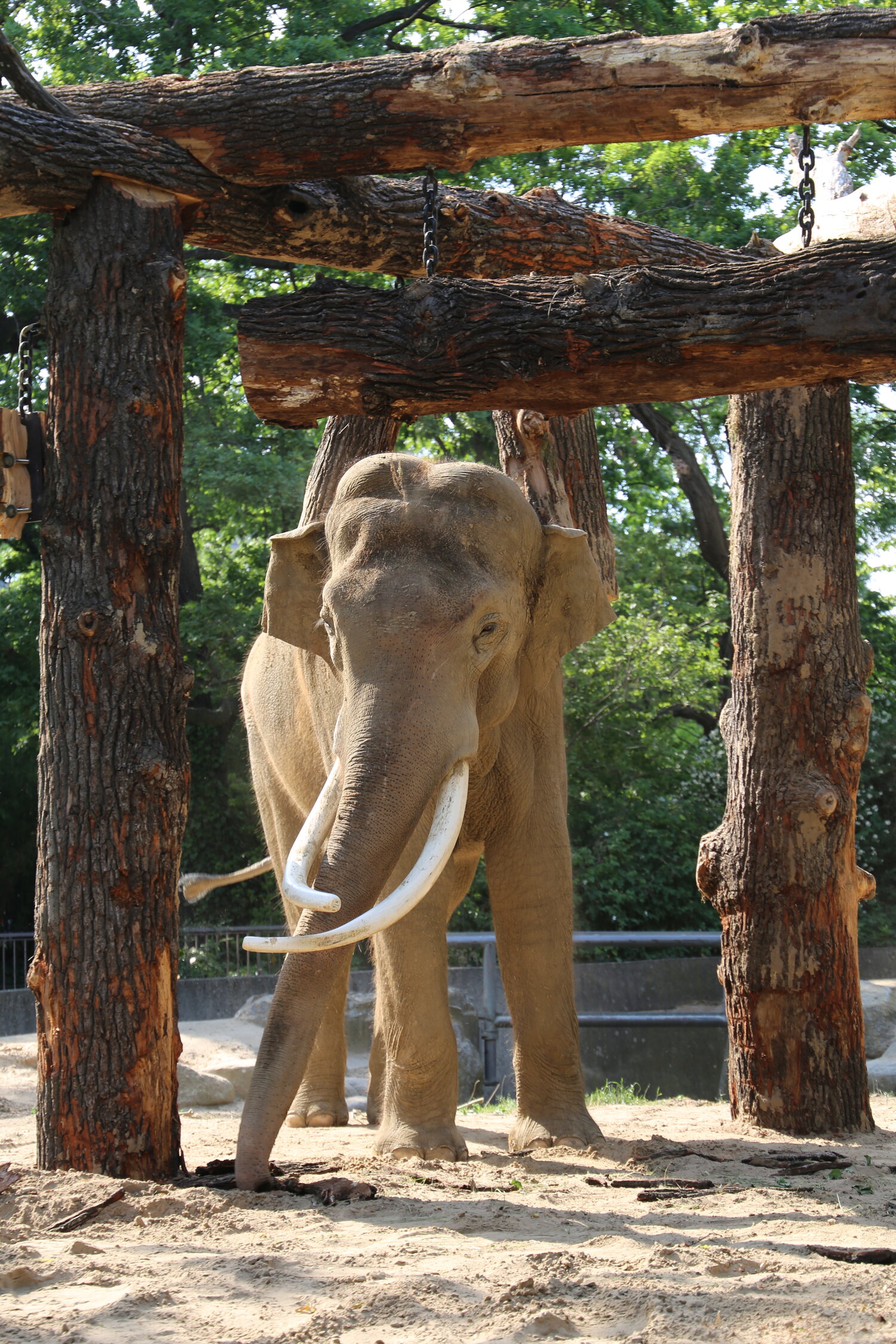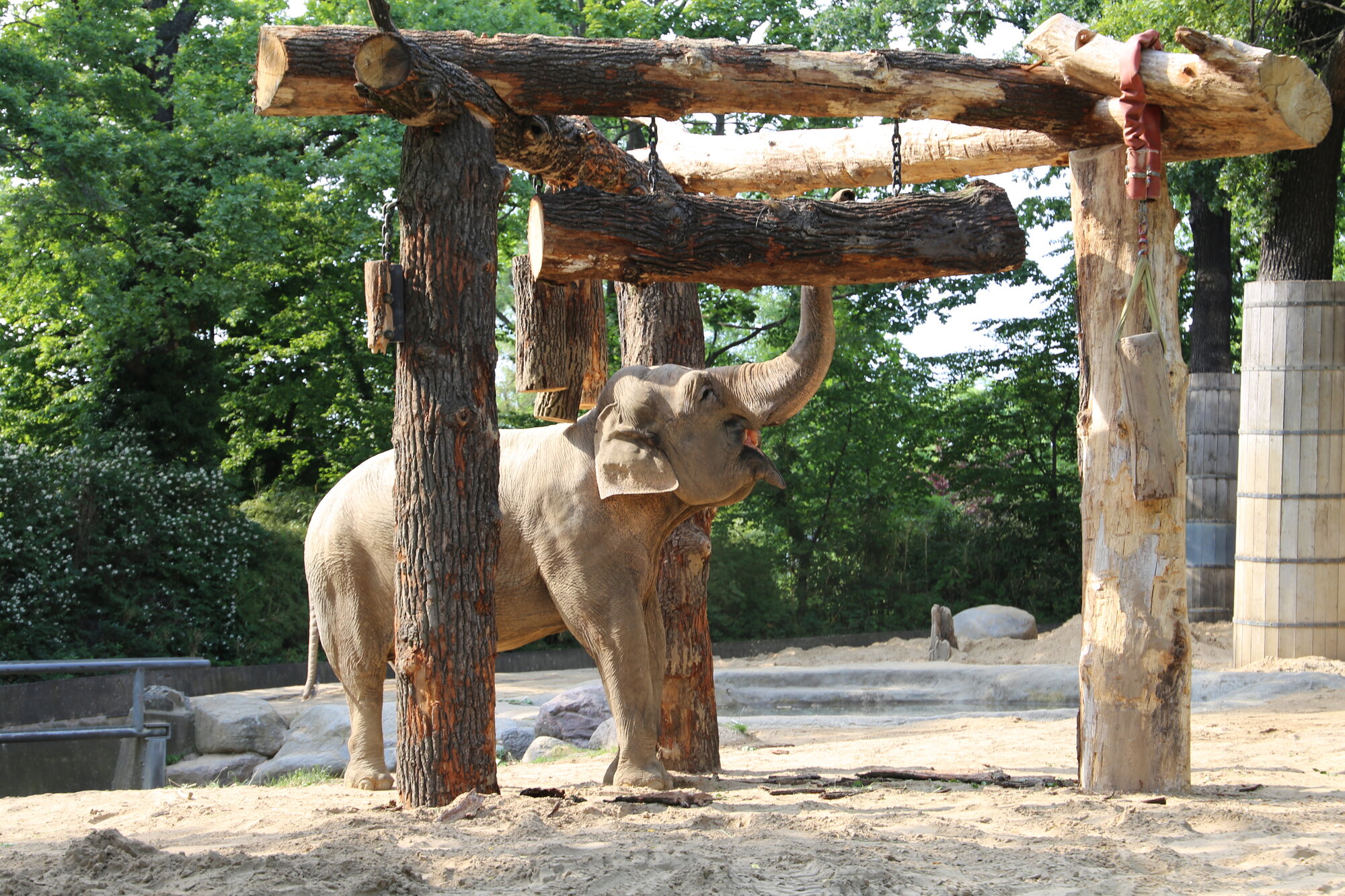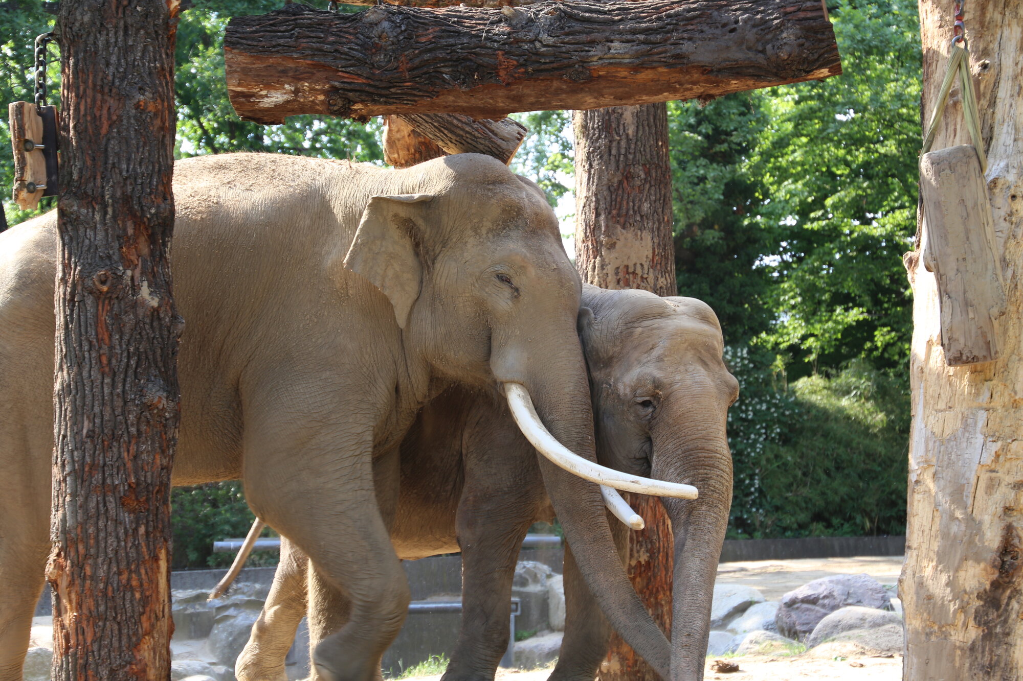 In den letzten Tagen wurde an einem neuen Spielwald für Victor und Drumbo gewerkelt. Die Holzkonstruktion wird nicht nur für Spiel und Spaß sorgen, sondern auch durch Schubbern und Co. der Wellness dienen. Die beiden Dickhäuter haben das ungewöhnliche Objekt schon genauestens unter die Lupe genommen – mit Erfolg, beide zeigen bereits große Freude daran.