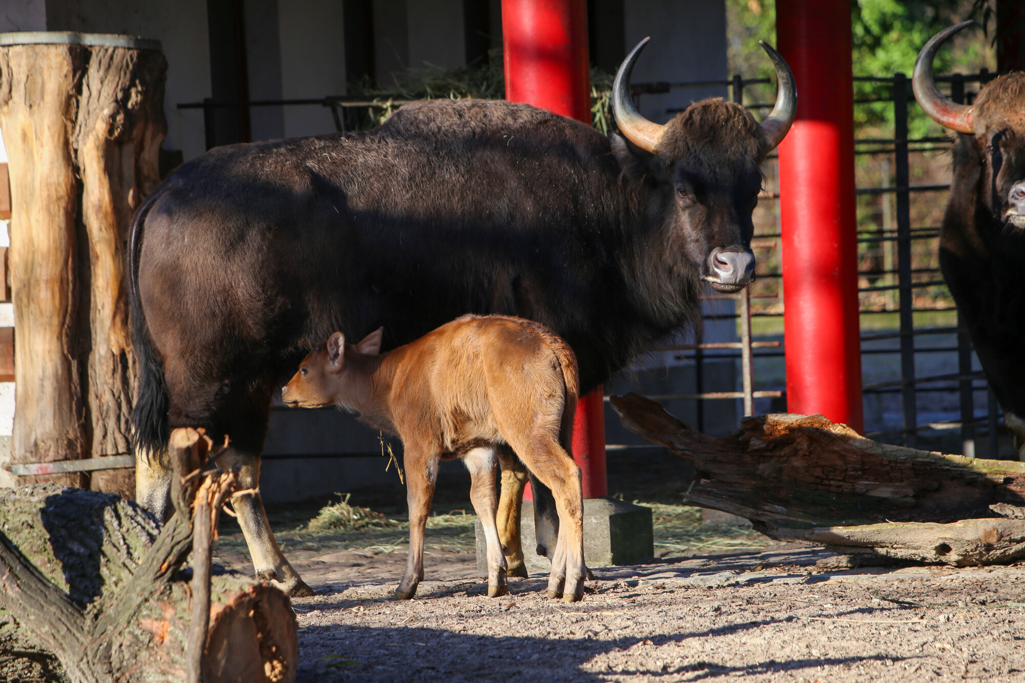 Am 26. Januar ist im Zoo Berlin ein Gaur-Jungtier zur Welt gekommen. Sieben Jahre nach der letzten Geburt bei dieser gefährdeten Wildrinderart wächst damit wieder ein seltenes Kälbchen in der Hauptstadt heran. Die Tierpfleger*innen haben es auf den Namen Grisu getauft. „Der Kleine ist inzwischen rund einen Monat alt und hat sich so gut entwickelt, dass er in dieser Woche das erste Mal mit seiner Mutter die Außenanlage erkundet hat“, berichtet Zoo- und Tierparkdirektor Dr. Andreas Knieriem und ergänzt: „Die markanten Hörner, welche sich nach der Geburt nur als kleine Ansätze andeuten, können bis zu 90 cm lang werden. Die charakteristischen weißen Strümpfe lassen sich schon jetzt erahnen.“ Noch ist Grisu cappuccinofarben. Der Wechsel zum dunkelbraunen Erwachsenenkleid beginnt in der Regel ab dem dritten Lebensmonat. Erst dann werden die hellen „Socken“ richtig sichtbar. Bei Bullen kann dieser Farbwechsel länger dauern. Der Vater Mazlik (6) stammt aus dem Zoo Mysore in Indien, die Mutter ist die gebürtige Berlinerin Gretel (7). Sie kam 2018 im Zoo Berlin zur Welt und war damit der letzte Nachwuchs dieser Art in Berlin – nun setzt sie diese Berliner Linie als Mutter fort.