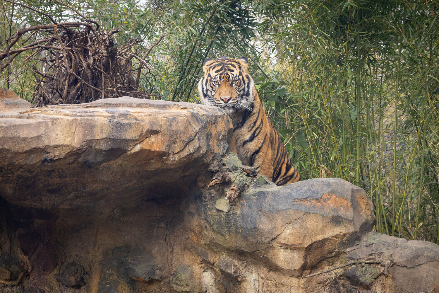 Zwischen dichtem Bambus und plätschernden Bächen ist im Zoo Berlin eine neue Dschungellandschaft entstanden, die den Sumatra-Tigern Banyu (2) und Luise (3) ein abwechslungsreiches Zuhause und schattige Rückzugsorte bietet. Noch erkunden die zwei jungen Tiger scheu die fremde Umgebung, doch hin und wieder lässt sich durch das dichte Grün ein Blick auf die seltenste Großkatze der Welt erhaschen.
