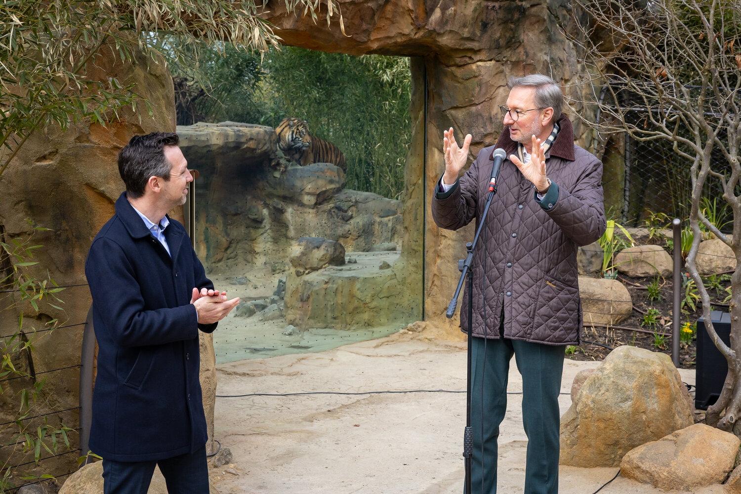 Das Bauprojekt hat insgesamt rund 7,6 Millionen Euro gekostet, der Zoo zahlte davon 3,7 Millionen Euro. Das Land Berlin förderte mit 3,9 Millionen Euro diese Anlage über Mittel der Gemeinschaftsaufgabe „Verbesserung der regionalen Wirtschaftsstruktur“ (GRW). Staatssekretär Dr. Severin Fischer, Senatsverwaltung für Wirtschaft, Energie und Betriebe, war heute zur Eröffnung der neuen Netzanlage im Zoo Berlin zu Gast. „Der Zoo Berlin ist eine der traditionsreichsten Attraktionen der Stadt und begeistert Besucherinnen und Besucher aus aller Welt wie Berlinerinnen und Berliner gleichermaßen. Mit der neuen Netzanlage am Raubtierhaus bekommt der Zoo ein neues Highlight und erweitert den Lebensraum für seine Tiger. Der Zoo investiert mit Unterstützung des Landes Berlin stetig in artgerechte Haltung und moderne Anlagen. Ich freue mich, dass die Senatswirtschaftsverwaltung Umbau und Modernisierung des Berliner Zoos seit 2016 mit GRW-Fördermitteln in Höhe von rund 20,4 Millionen Euro unterstützt - vom Neubau der Nashornpagode über die Erneuerung von Wegen, Beschilderungen und Sanitäranlagen bis hin zu der heute eröffneten neuen Tigeranlage am Raubtierhaus. Mit weiteren GRW-Mitteln, etwa für die Modernisierung des Aquariums und die touristische Aufwertung des Alten Turms der Kaiser-Wilhelm-Gedächtniskirche, stärken wir nachhaltig die touristische Infrastruktur der City West, sichern Wertschöpfung und gute Arbeit in Berlin und leisten einen Beitrag zu einem wirtschaftlich starken und touristisch attraktiven Berlin.“