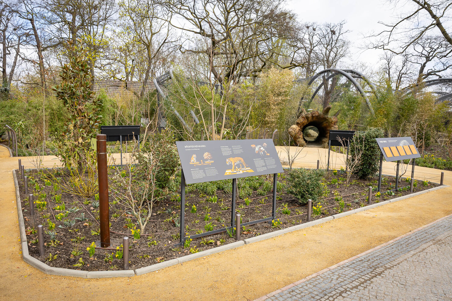 Gegenüber der bisherigen Tigeranlage im Reich der Jäger ist auf dem Gelände der ehemaligen Stelzvogelwiesen in den vergangenen zwei Jahren ein modernes Habitat entstanden, das den besonderen Ansprüchen von agilen Großkatzen gerecht wird und gleichzeitig eindrucksvolle Einblicke in das Leben dieser faszinierenden Tiere ermöglicht. Die beiden Außenanlagen bieten vielfältige Strukturen mit Wasserbecken, Flusslauf, kleinem Wasserfall, beheizten Liegeflächen sowie Kratz- und Kletterbäumen. Überspannt wird das Areal von einem rund 2.500 Quadratmeter großen Netz aus mehr als 60 Kilometern Edelstahldraht. Sieben Doppelbögen tragen die Konstruktion: Der längste Stahlbogen misst 25 Meter, hat einen Durchmesser von 25 cm und wiegt acht Tonnen. Auch im Untergrund wurde aufwendig gebaut: Damit die Konstruktion im weichen Berliner Boden dauerhaft stabil bleibt, stehen die Stahlbögen auf sogenannten Mikropfählen aus Beton, die je nach Position bis zu 14 Meter tief in die Erde reichen. Die Glasscheiben an den Besuchereinblicken sind vier Zentimeter stark und halten selbst einem 300 Kilogramm schweren Tiger problemlos stand. Ein hohler Baumstamm bietet Kindern einen abenteuerlichen Einblick in diesen neuen Dschungel-Lebensraum.