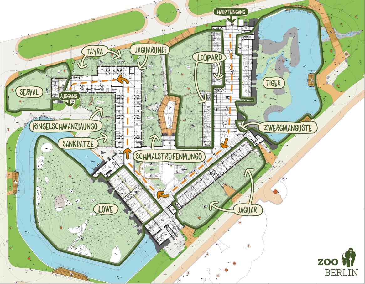 Up to now, the big cat facilities at Zoo Berlin have been dominated by metal bars and tiles, which clearly no longer met the demands of modern animal keeping. As a result, the entire Predator House is now undergoing extensive renovation work. During a planned construction period of just under a year and a half, bars will be replaced by glass, tiles by artificial rock, and habitats will be created that better resemble the animals’ homes in the wild. Several of the former cage-like enclosures will be merged, and certain habitats will be extended into the visitor’s area to provide more space for the larger inhabitants in particular. A full thematic redesign will also create enclosures that reflect the natural habitats of their residents. In the future, for example, the jaguars will be able to take a dip in a South-American-style lagoon.